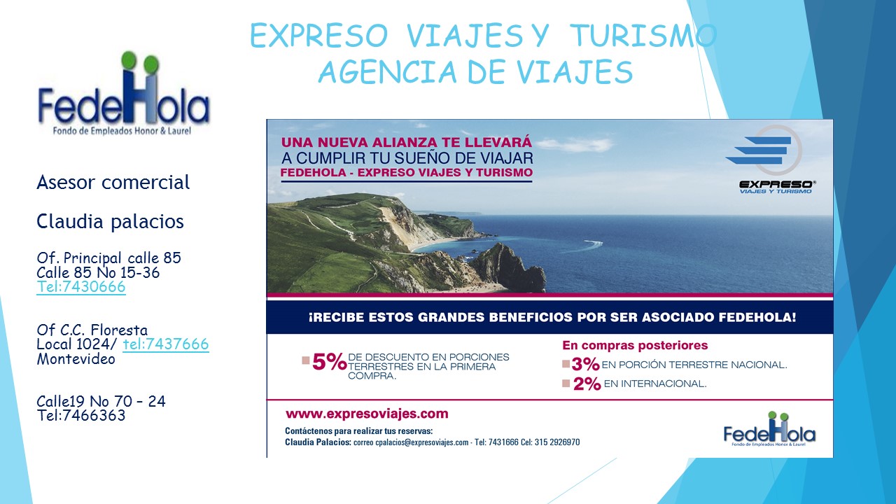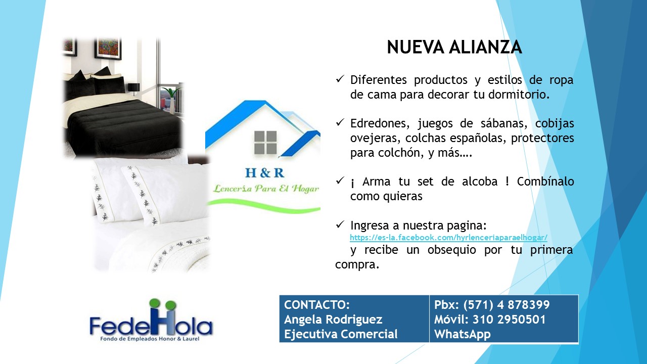 Convenios FEDEHOLA Auteco ¡Clic Aquí! Bermotos Colchones Ensueño ¡Clic Aquí! Mundo Aventura Salitre Magico Finkana Jaime Duque Style Vision Cine Colombia ¡Clic Aquí! Expreso Viajes ¡Clic Aquí! MatiSaurio ¡Clic Aquí! H&R ¡Clic Aquí! Salud Visual Empresarial ¡Clic Aquí! Time Spa ¡Clic Aquí! Olivos ¡Clic Aquí! Intravial ¡Clic Aquí! Innovar ¡Clic Aquí! Comuniquese con los asesores de nuestros convenios Ver contactos
